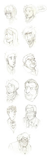 I think my favourite thing to do is to draw heads. When I sit down to work, the first thing I do is draw a head of some sort. Though they rarely progress any further... South I guess... I find it interesting to experiment with head shape and build, especially overweight faces and old faces recently. They're just so much more interesting to draw! I think I'm getting the hang of facial structure too which goes a long way to making them believable, and strongly informs the use of expression. The next step is to play more with dynamics and angle variation, but this will come in due time...